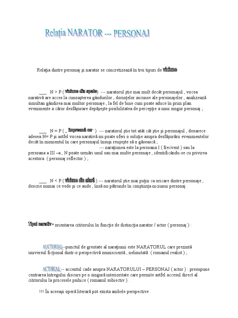 Narator omniscient cand relatarea evenimentelor se face la persoana a iii a iar vocea pare sa cunoasca tot ce se intampla personajelor narator personaj cand relatarea se face la persoana i naratorul devenind personaj in text exprimandu si parerea cu privire la fapte. Povestea diegeza evenimentele relatate. La întoarcerea mea voi avea mult de cetit și această perspectivă mă bucură. Moartea unui deputat dintr o regiune romînească îi deschidea din nou perspectiva candidaturii.