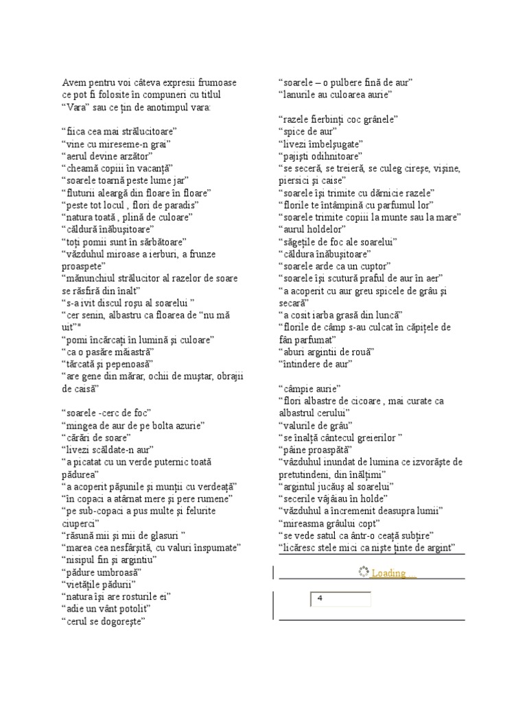 Compuneri despre vară. Iarna expresii frumoase iarna a asternut pe cer nori cenusii. Oricât te ai strădui să scrii o compunere bună dacă nu folosești și expresii frumoase nu vei reuși. A acoperit pamantul cu zapada alba si pufoasa.
