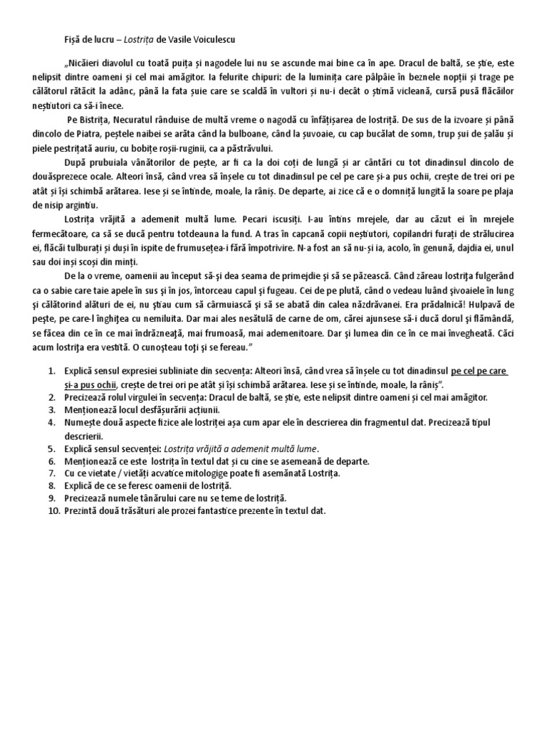 Este o povestire fantastică deoarece îmbină planul real cu cel fabulos şi este o povestire în ramă întrucât întreaga acţiune se subordonează legendei despre tânărul aliman şi lostriţa fermecată pe care pescarii. Locul aparte pe care il ocupa in. Lostriţa de vasile voiculescu comentariu literar rezumat literar crispedia ro. Vaˈsile vojkuˈlesku literary pseudonym v.