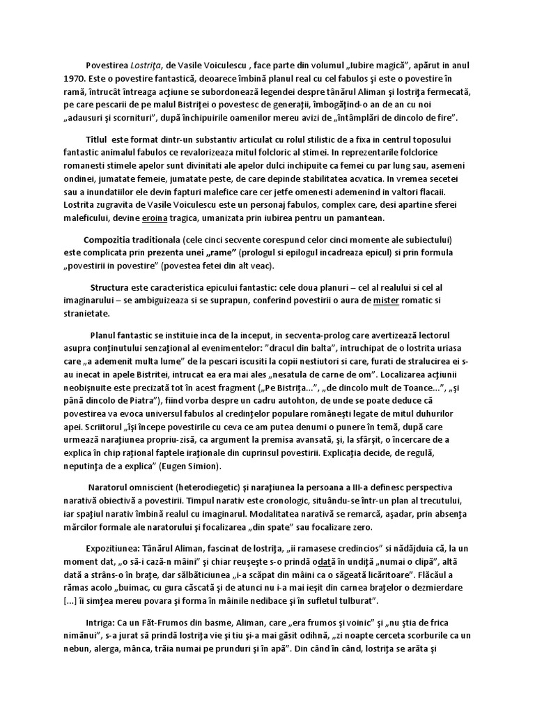 Lostrita de vasile voiculescu. De vasile voiculescu de a lungul râului bistrita una dintre placerile localnicilor era pescuitul. Nicaieri diavolul cu toata puita si nagodele lui nu se ascunde mai bine ca in ape. Povestirea lostrița a fost scrisă de către vasile voiculescu și inclusă în volumul iubire magică publicat abia în anul 1970 după moartea autorului încadrându se astfel în proza contemporană fiind o povestire fantastică realul și imaginarul se îmbină armonios iar faptul că întreaga acțiune să subordonează legendei despre tânărul aliman pe care pescarii o spun. Acesta era un tânar chipes voinic si saritor.